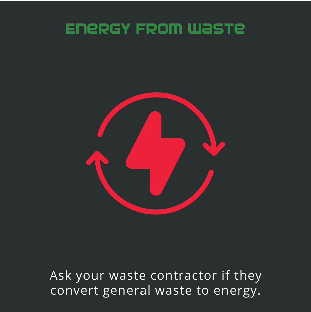 - Energy from waste – do you know exactly where your general waste goes? Ask your waste contractor if they convert general waste to energy, rather than taking it to landfill.