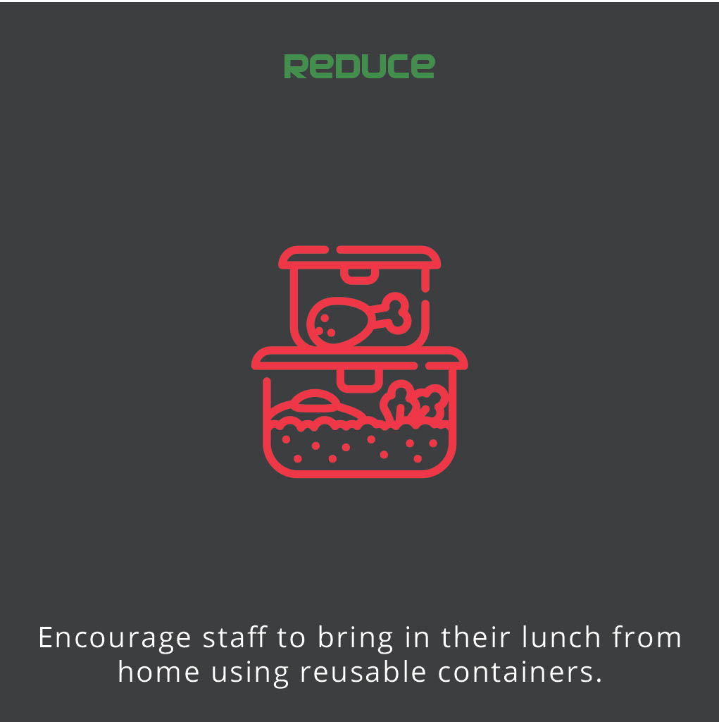 - Encourage staff to bring in their lunch from home using reusable containers. This will reduce single use food packaging and save money at the same time!
