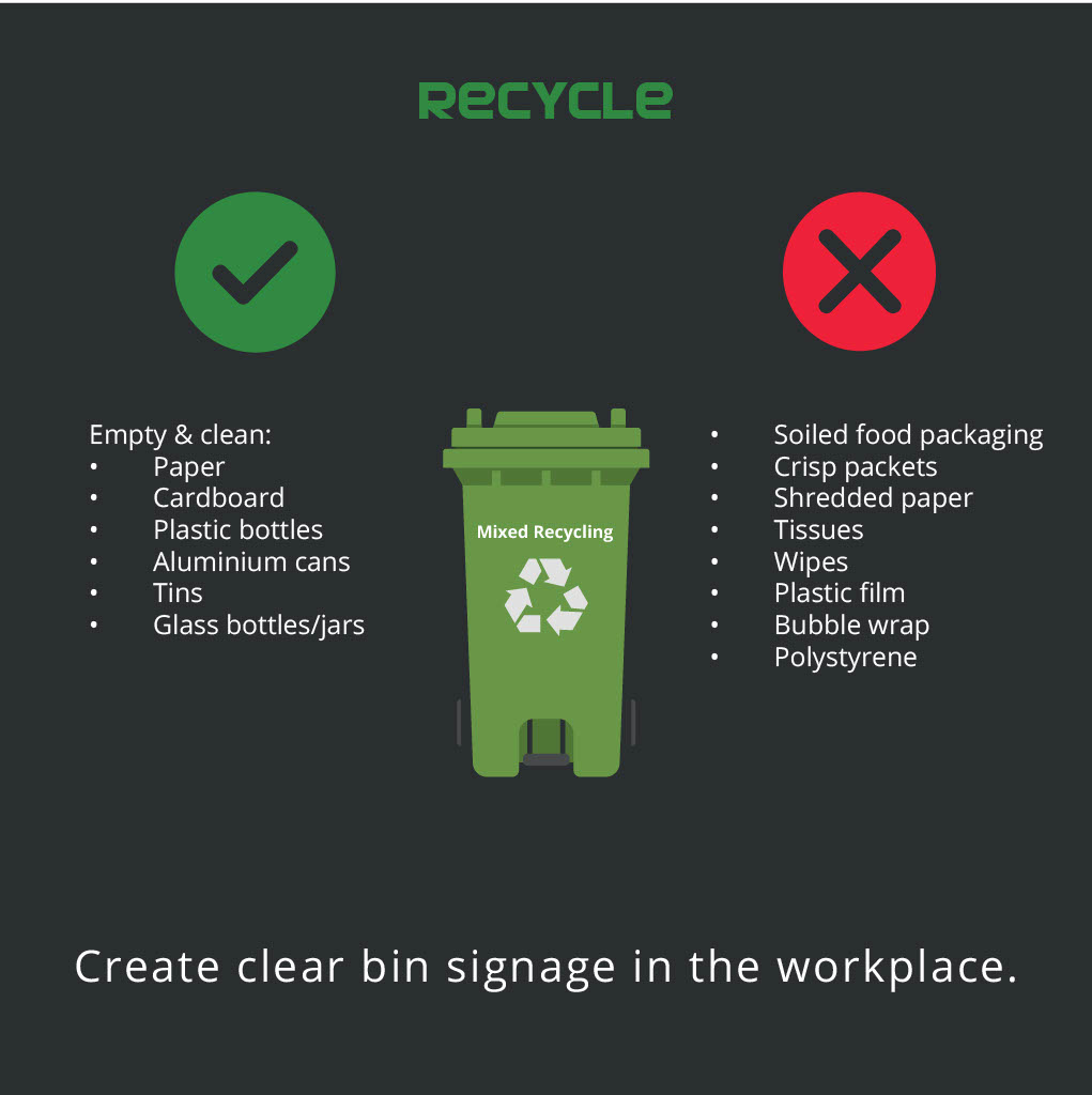 - Create bin signage in the workplace, making it clear to your workforce what items go in recycling bins and what goes into general waste – a greater awareness will mean your joint efforts won’t go to waste.