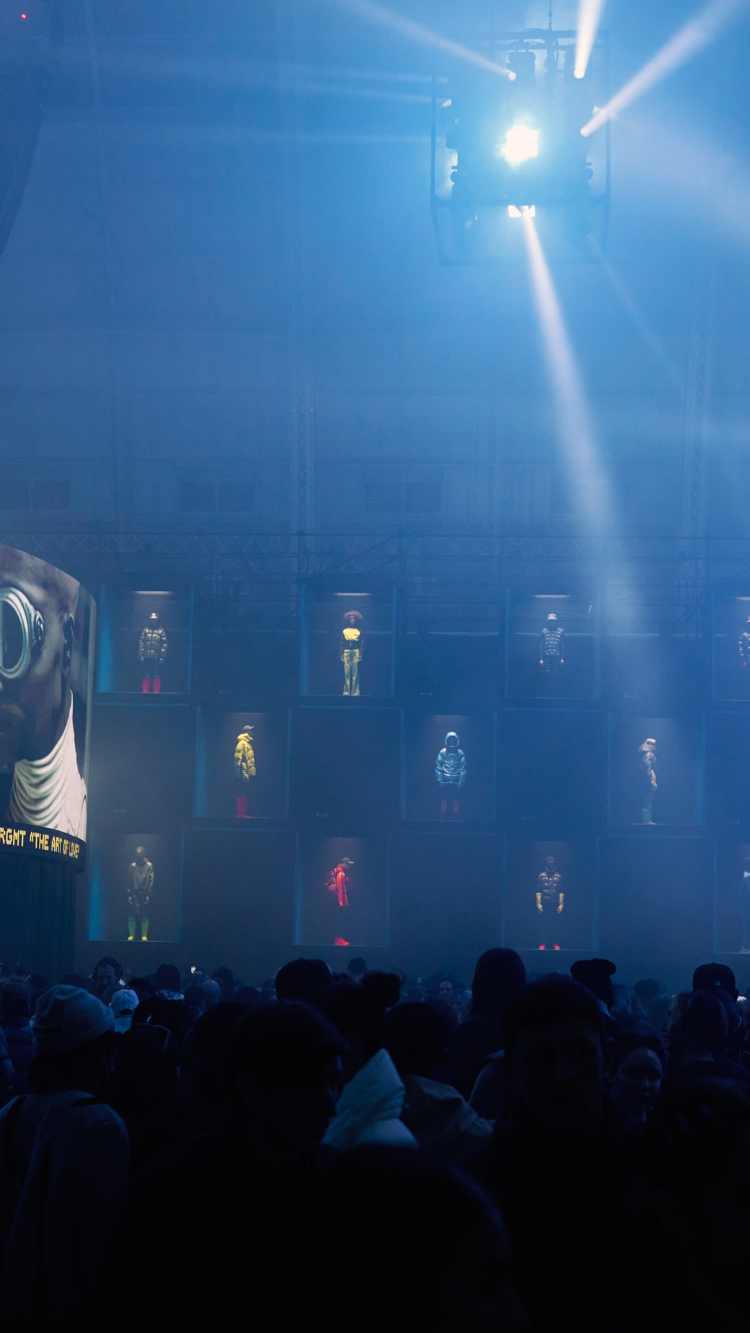 Neg Earth Lights are thrilled to have been the supplier of lighting fixtures in the Moncler Genius show as well as a Kinesys motor system which supported various luminaires at the exhibition including high performance Robe  and Ayrton fixtures. Additionally, there were unique pods which hung throughout the room from our automated motor systems. The lighting powerfully projected outwards in narrow beams into the room giving a futuristic, space-age atmosphere. Moreover, this out of this world spectacular helped to truly express the innovative nature of the Moncler Genius collective through an incredible immersive display.
